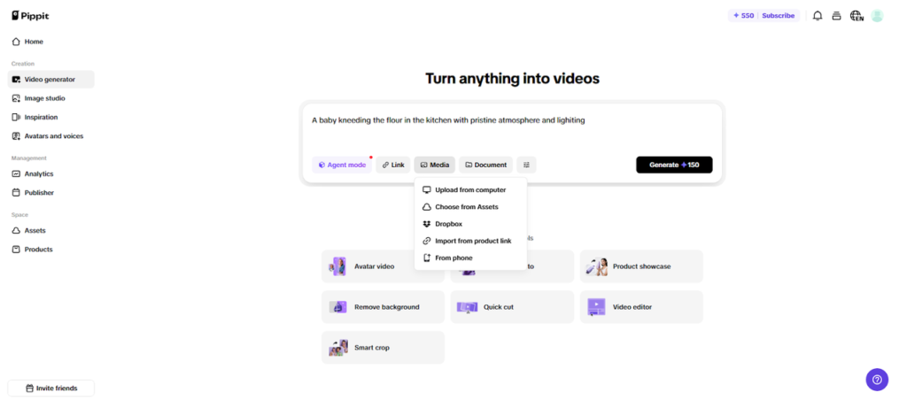Access Pippit and signup, then open the “Video generator” tab. Add a text prompt that captures your brand message. To keep visuals aligned, click the “Add media” tab and upload reference files. Use your phone, device, Dropbox, or paste a link. If nothing is ready, pick from assets. Once prepared, hit the “Generate” tab.