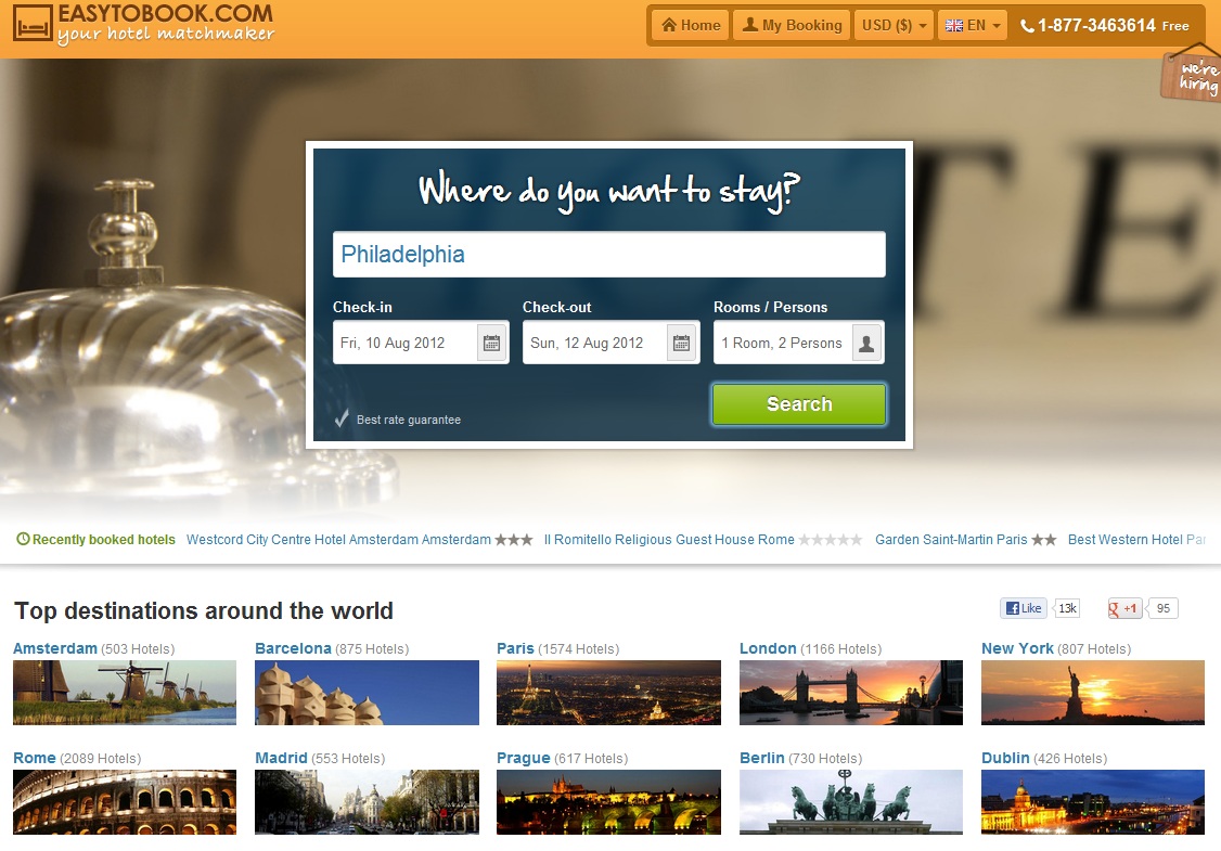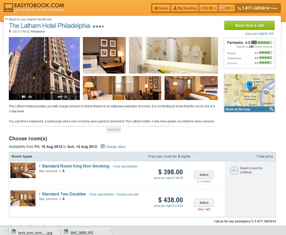 On my recent trip up to Philly, I decided to try out a hotel booking website called EasyToBook.com that a friend told me about. With the competition pretty fierce these days for hotel booking websites, it’s rare to find much of a better deal on one or the other so for me ease of use is just as important.