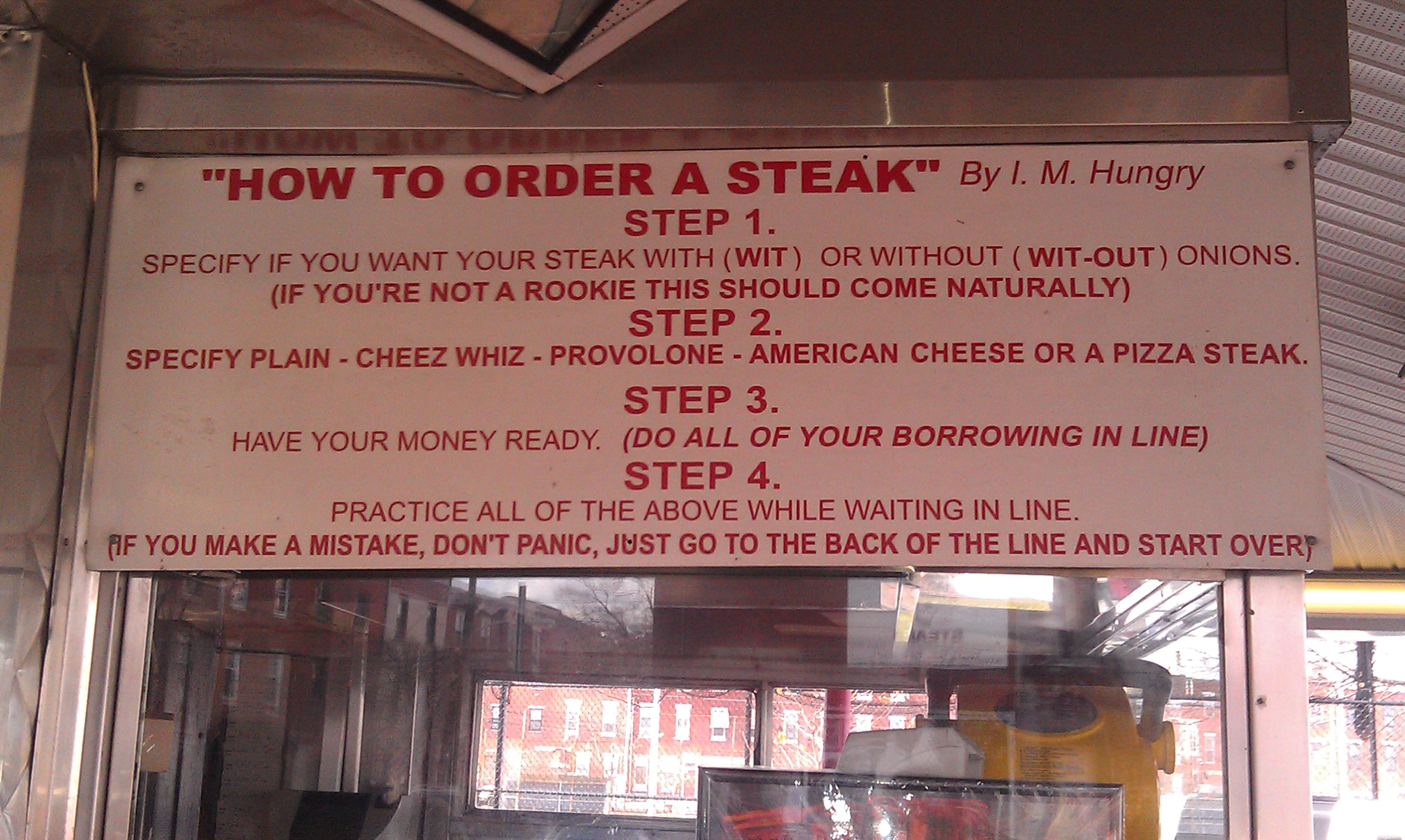 When eating a cheese steak, if it’s listed in a menu as a “Philly Cheese Steak” or a “Philly Steak and Cheese”, then 1. You’re not in Philly and 2. Order it so when you come to Philly and have one for yourself, you can say how shit that one you ordered at Applebee’s in Orlando was diarrhea between wonder bread.
