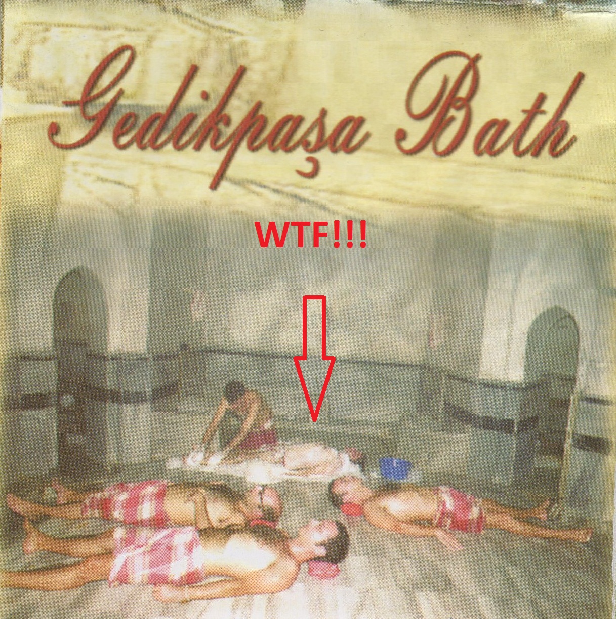 I lasted about 3 minutes and then decided I best get out of there before I passed out. I entered the room where I originally saw the old men washing themselves, but they were no longer against the walls. They were now face down on a huge marble slab in the middle of the room being vigorously rubbed down with soapy water by hairy shirtless Turkish men…NOOOO!!!!!